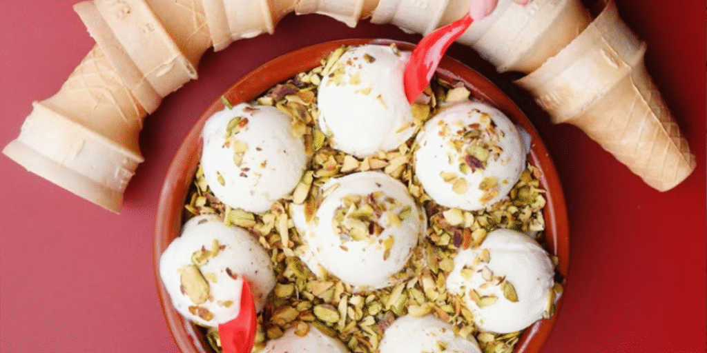 Our signature Ashta Ice Cream topped with crushed pistachios is one of the most loved flavors among customers.